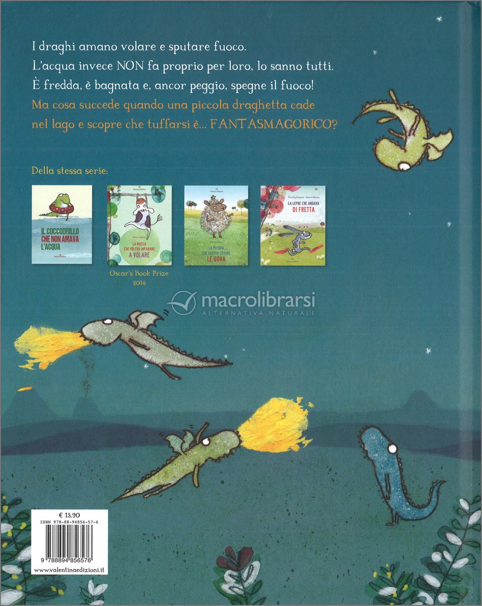 I draghi amano volare e sputare fuoco. L'acqua invece non fa proprio per loro, lo sanno tutti. È fredda, è bagnata e, ancor peggio, spegne il fuoco! Ma cosa succede quando una piccola draghetta cade nel lago e scopre che tuffarsi è... fantasmagorico?