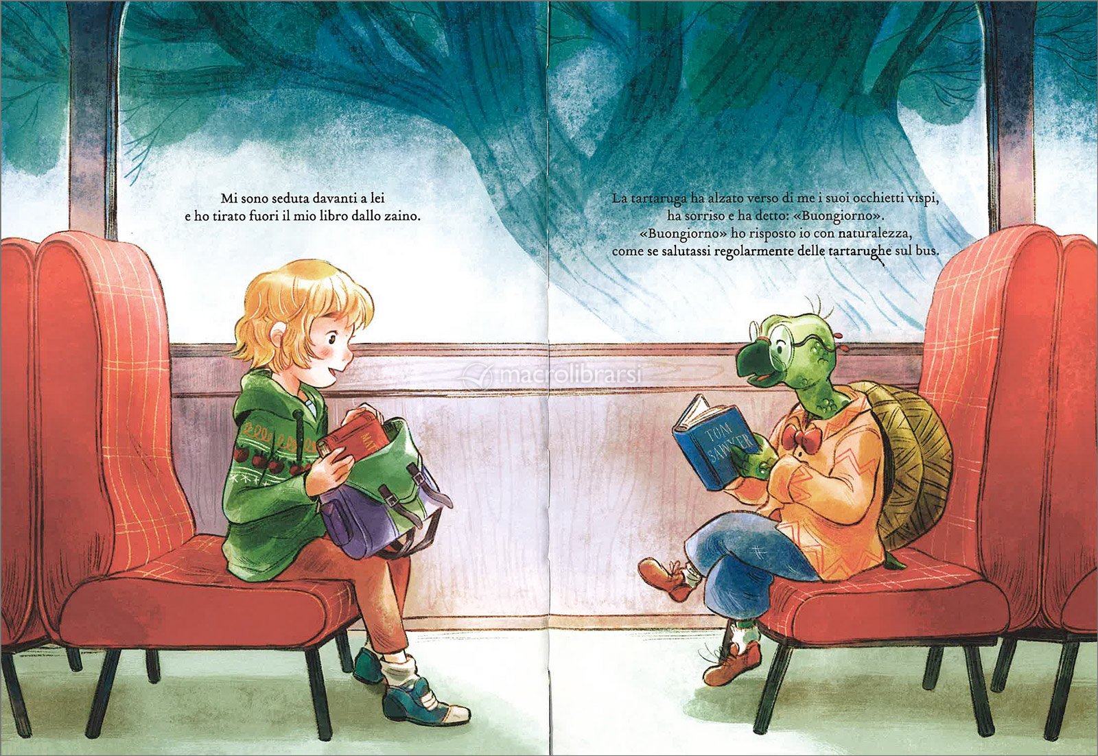 A bordo del bus 65, il tragitto verso la scuola si trasforma in un’avventura sorprendente, popolata da animali lettori, libri condivisi e incontri improbabili, dove ogni pagina apre a nuovi mondi.