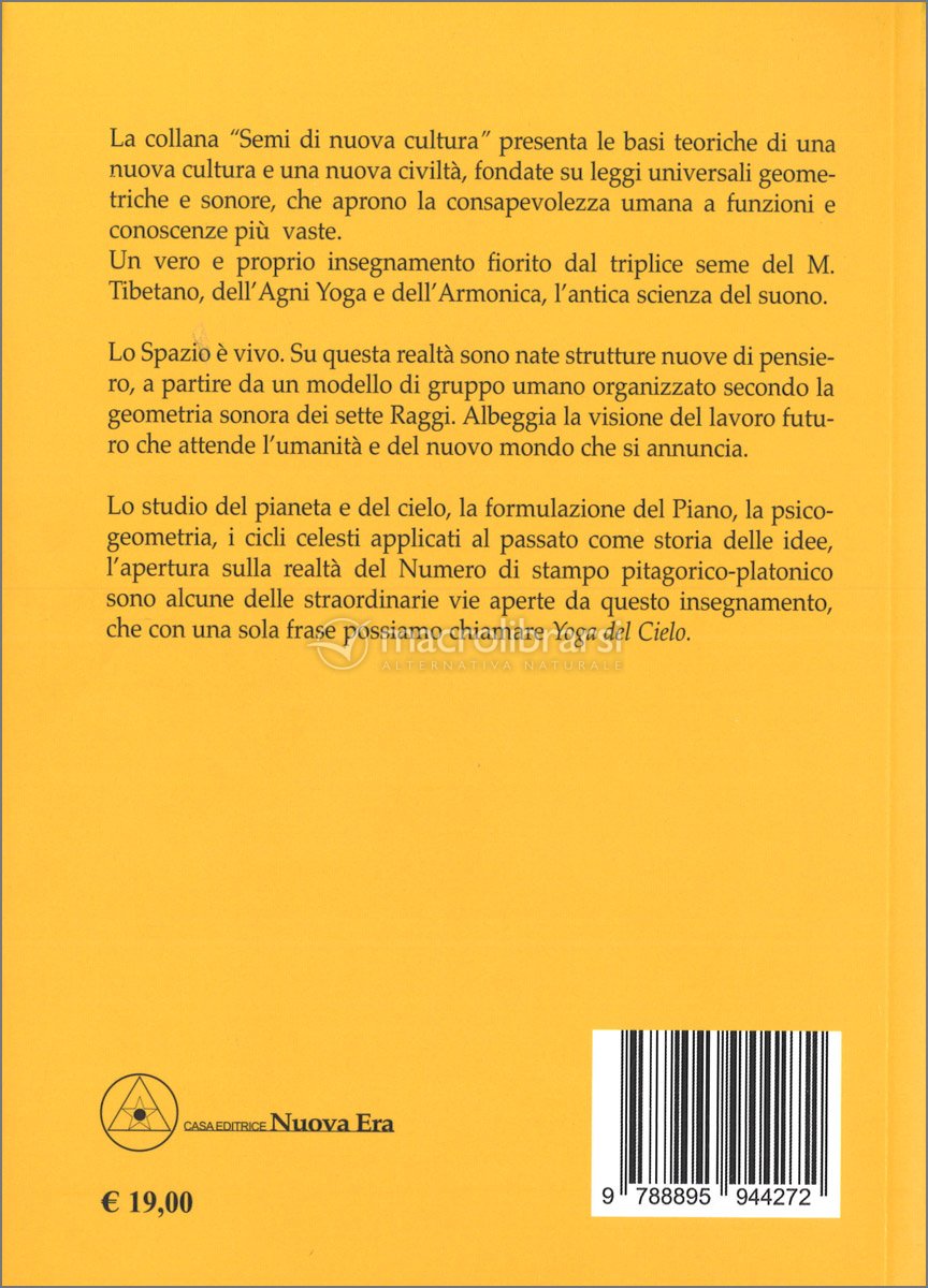 Lo studio del pianeta e del cielo, la formulazione del Piano, la psicogeometria, i cicli celesti applicati al passato come storia delle idee, l'apertura sulla realtà del Numero di stampo pitagorico-platonico sono alcune delle straordinarie vie aperte da questo insegnamento, che con una sola frase possiamo chiamare Yoga del Cielo.