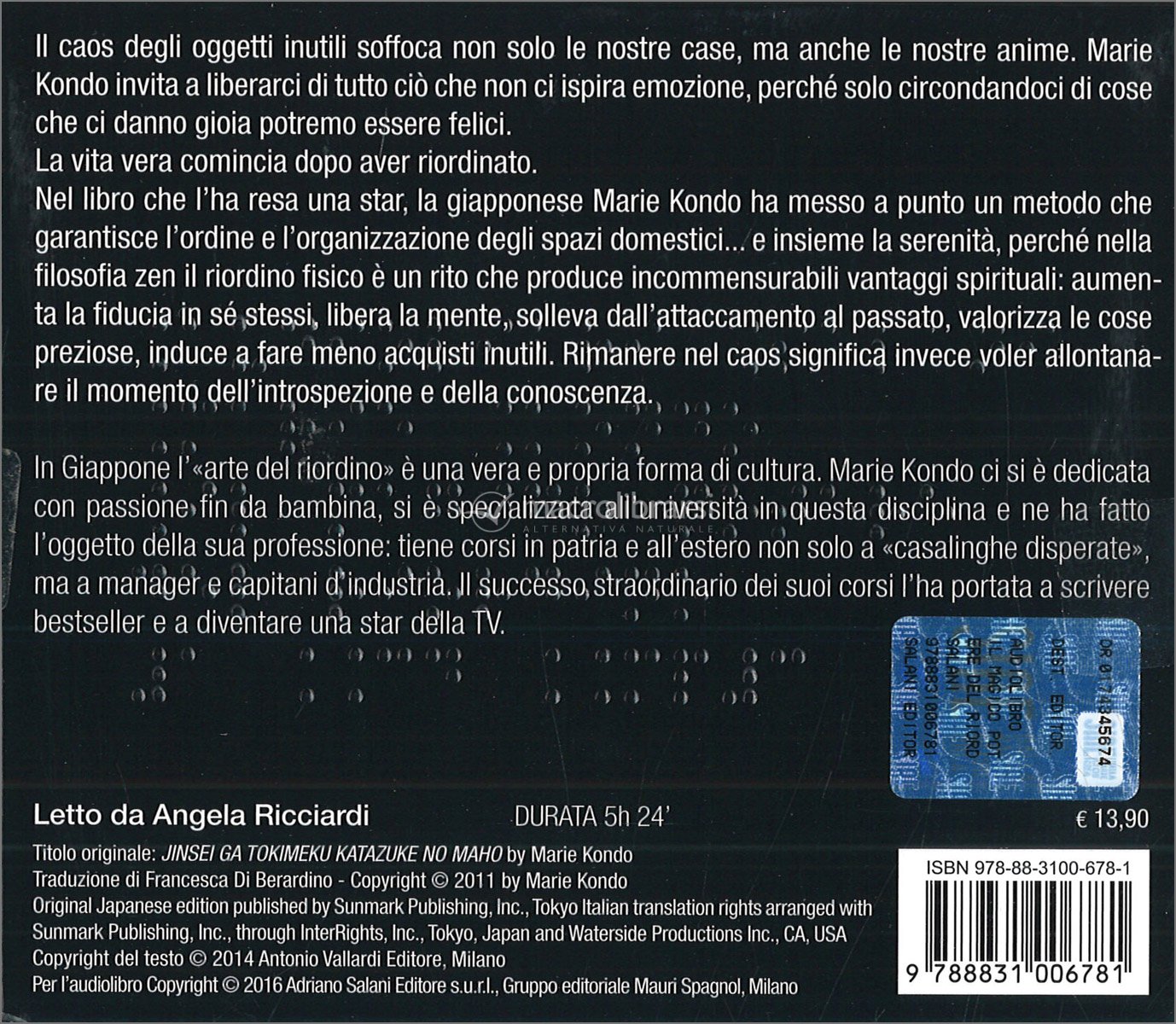 Il suo libro è la bibbia di tutte le casalinghe, disperate e non, ma anche di manager e professionisti, che vogliono fare ordine nei loro ambienti e nella loro vita frenetica. Ma per chi non ha il tempo e le energie per leggere? Oggi è disponibile l'audiolibro integrale, in 2 comodi CD Mp3, letto da Angelica Ricciardi.