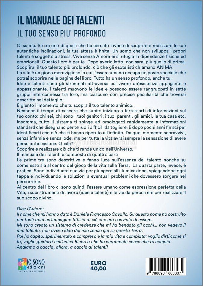 Nel MANUALE DEI TALENTI l'Autore approfondisce con chiarezza il mondo delle sette espressioni della trinità che danno vita alla nostra realtà. Esse sono delle qualità ben precise che devono essere portate in espressione da ogni essere dotato di coscienza affinché l'IO diventi consapevole di SE STESSO.