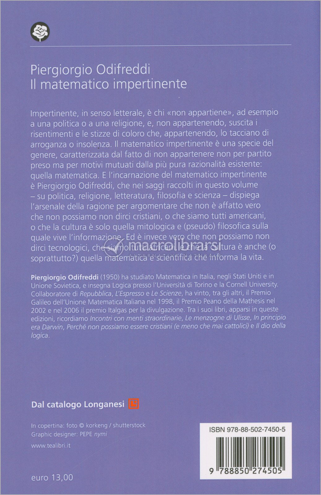 E l'incarnazione del matematico impertinente è Piergiorgio Odifreddi, che nei saggi raccolti in questo volume – su politica, religione, letteratura, filosofia e scienza – dispiega l'arsenale della ragione per argomentare che non è affatto vero che non possiamo non dirci cristiani, o che siamo tutti americani, o che la cultura è solo quella mitologica e (pseudo) filosofica sulla quale vive l'informazione.