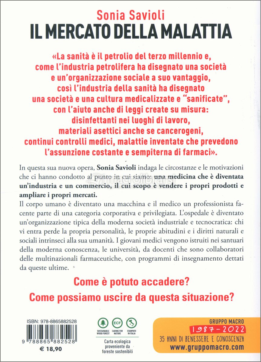 Il mercato della malattia vale migliaia di miliardi di euro ogni anno, più delle guerre. Ecco perché l'autrice, Sonia Savioli, ha scelto di indagare le circostanze e le motivazioni che ci hanno condotto al punto in cui siamo: un’umanità che ha perso il legame con la natura e di conseguenza anche il senso delle proporzioni e della realtà della vita; una cultura e una civiltà dominate dalla competizione economica e sociale, animate dall’unico impulso di trasformare tutto ciò che esiste in fonte di profitto e potere, anche a scapito della nostra salute, anzi, trasformando proprio la malattia in una fonte di profitto, in un mercato.