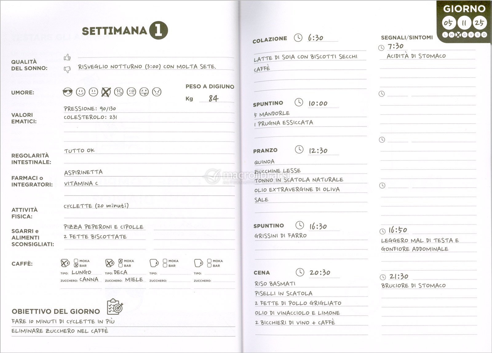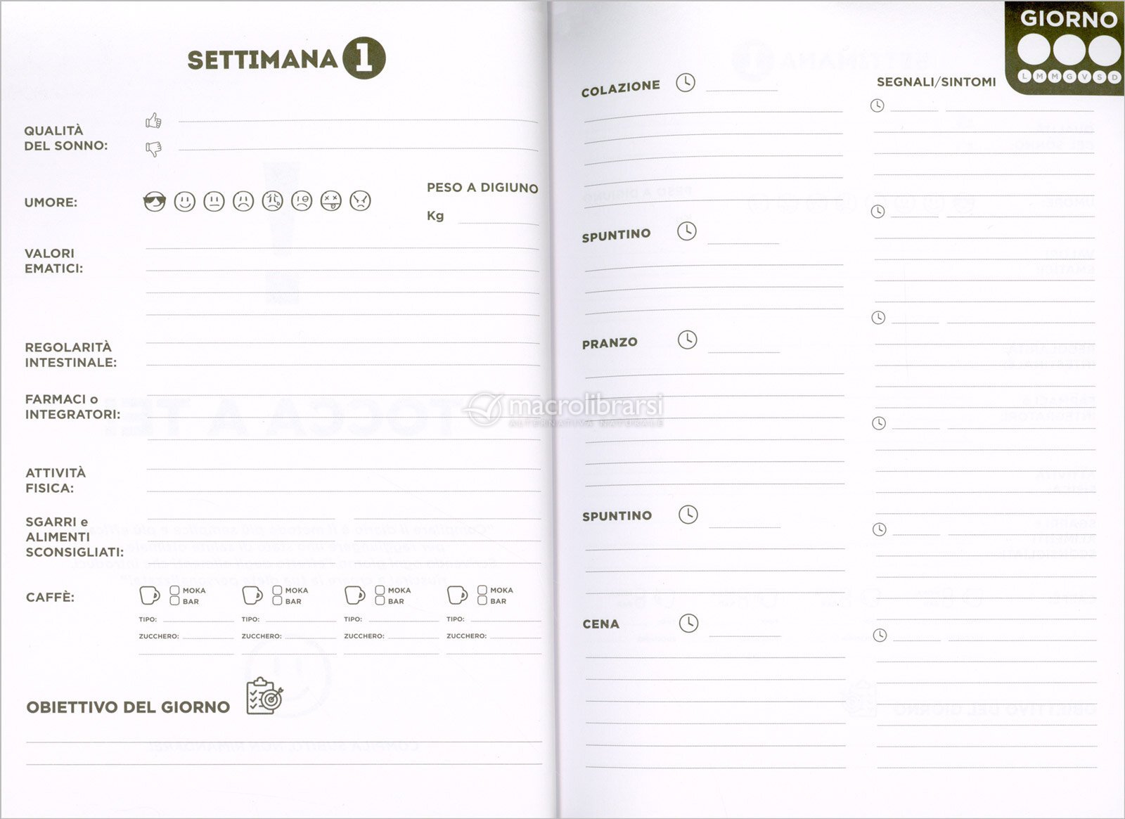 Ogni giorno il diario offre spazi precisi per annotare reazioni, sintomi, variazioni di energia e risposte fisiche, permettendo di individuare gradualmente gli alimenti più tollerati e quelli che creano disagio.