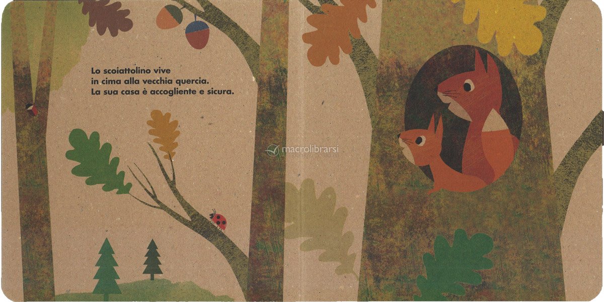 Lo scoiattolino vive in cima alla vecchia quercia. La sua casa è accogliente e sicura... Tra i rami degli alberi vivono anche tanti altri animali. Tutti preparano i loro nidi e accumulano provviste per quando giungerà l'inverno.