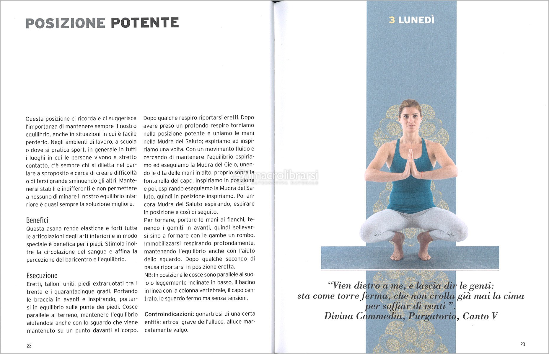 Comprende alcune posizioni (più energizzanti nei primi giorni della settimana, più rilassanti verso la fine), consigli e indicazioni sui colori da indossare, le pietre più adatte, i profumi, le meditazioni più efficaci.
