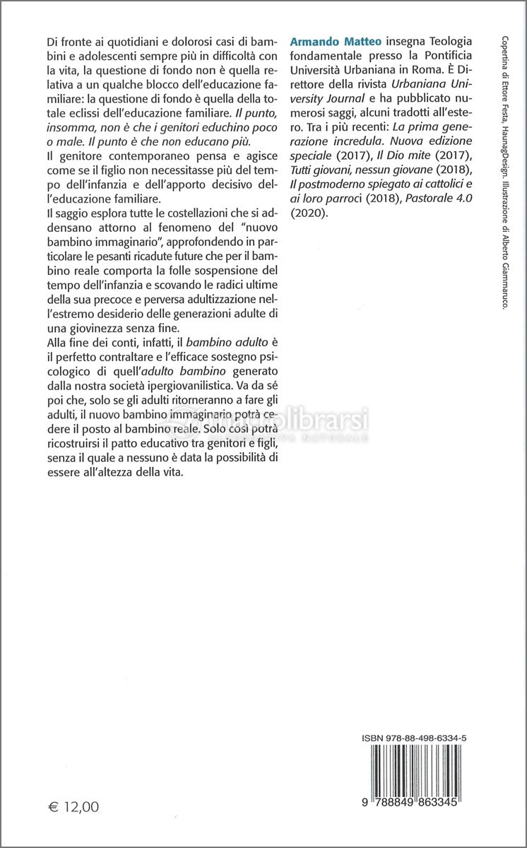 Va da sé poi che, solo se gli adulti ritorneranno a fare gli adulti, il nuovo bambino immaginario potrà cedere il posto al bambino reale. Solo così potrà ricostruirsi il patto educativo tra genitori e figli, senza il quale a nessuno è data la possibilità di essere all'altezza della vita.