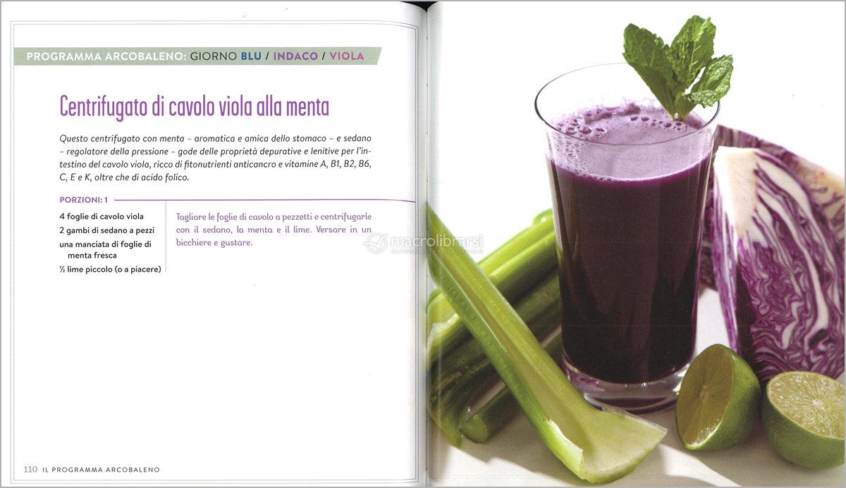 Ogni giorno si basa su un colore dell'arcobaleno - rosso, arancio, giallo, verde, blu/indaco/viola - garantendo il miglior profilo nutrizionale possibile e risultati assolutamente positivi. Un programma a base di centrifugati di verdura biologica cruda per ritrovare energia e liberarsi dei chili di troppo!