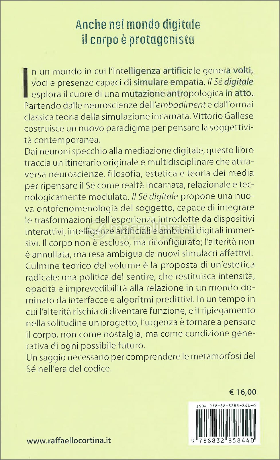 Il Sé Digitale - Dai neuroni specchio alla mediazione tecnologica di Vittorio Gallese è un saggio rigoroso e innovativo che ripensa la soggettività umana nell’epoca delle tecnologie immersive e delle intelligenze artificiali.