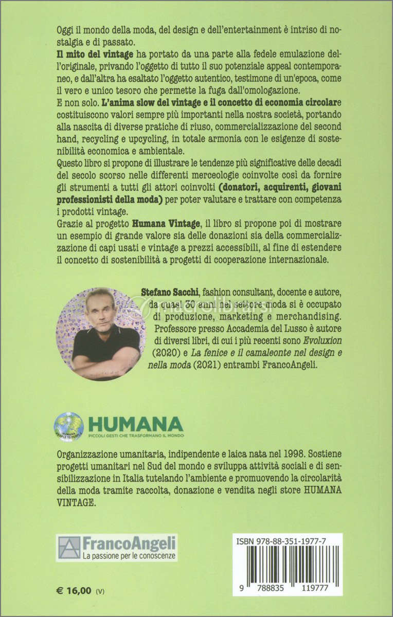 Questo libro si propone di illustrare le tendenze più significative delle decadi del secolo scorso nelle differenti merceologie coinvolte così da fornire gli strumenti a tutti gli attori coinvolti (donatori, acquirenti, giovani professionisti della moda) per poter valutare e trattare con competenza i prodotti vintage.