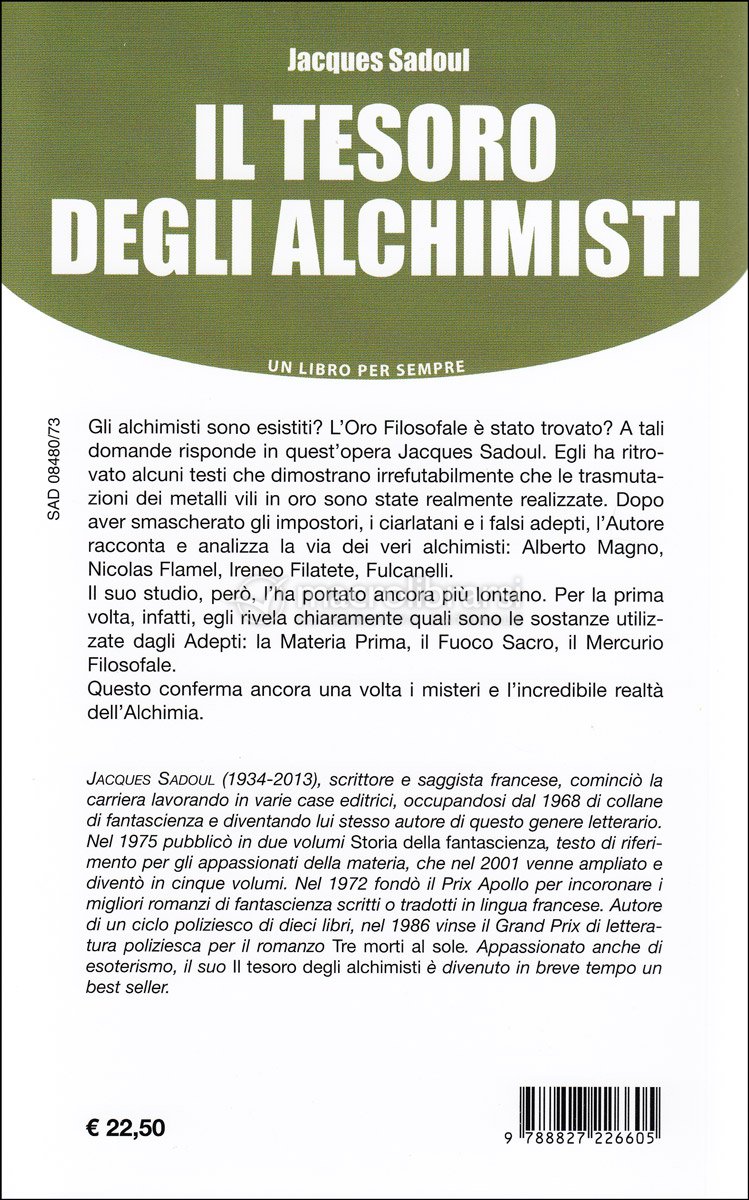 Gli alchimisti sono esistiti? L’Oro Filosofale è stato trovato? A tali domande risponde in quest’opera Jacques Sadoul. Lo scrittore ha ritrovato alcuni testi che dimostrano irrefutabilmente che le trasmutazioni dei metalli vili in oro sono state realmente realizzate. Dopo aver smascherato gli impostori, i ciarlatani e i falsi adepti, l’Autore racconta e analizza la via dei veri alchimisti: Alberto Magno, Nicolas Flamel, Ireneo Filatete, Fulcanelli.