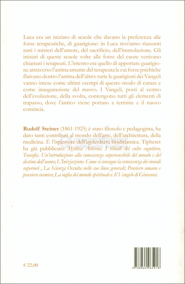 Luca era un iniziato di scuole che davano la preferenza alle forze terapeutiche, di guarigione: in Luca troviamo riassunti tutti i misteri dell’amore, del sacrificio, dell’immolazione. Gli iniziati di queste scuole volte alle forze del cuore venivano chiamati i terapeuti.