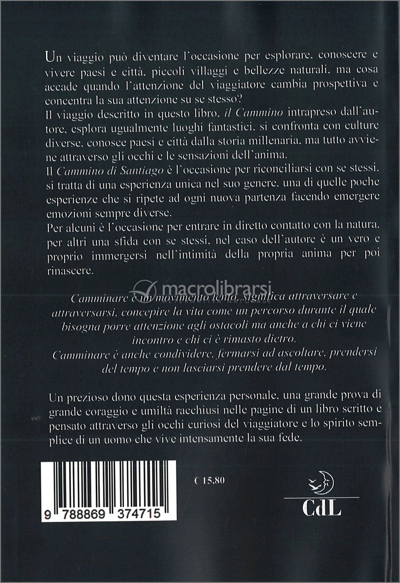 Il viaggio descritto in questo libro, il Cammino intrapreso dall’autore, esplora ugualmente luoghi fantastici, si confronta con culture diverse, conosce paesi e città dalla storia millenaria, ma tutto avviene attraverso gli occhi e le sensazioni dell’anima.
