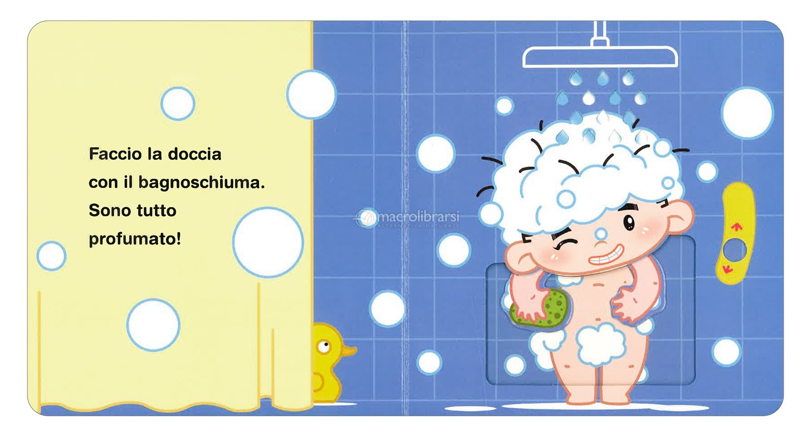 Con illustrazioni vivaci e cursori cartotecnici che si muovono pagina dopo pagina, i piccoli esplorano in modo giocoso l’esperienza del lavarsi, imparando a riconoscere e ripetere ogni gesto della routine del mattino e della sera.