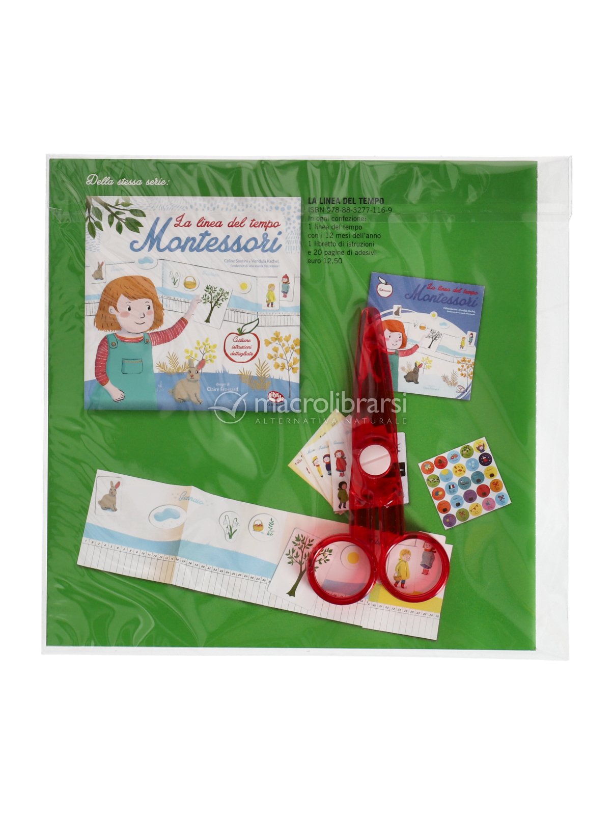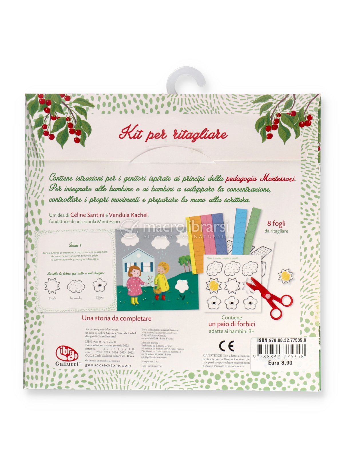 La robusta busta in cartoncino contiene 8 fogli da ritagliare, un paio di forbici adatte ai bambini dai 3 anni, un libretto con le istruzioni e una storia da completare coi ritagli.