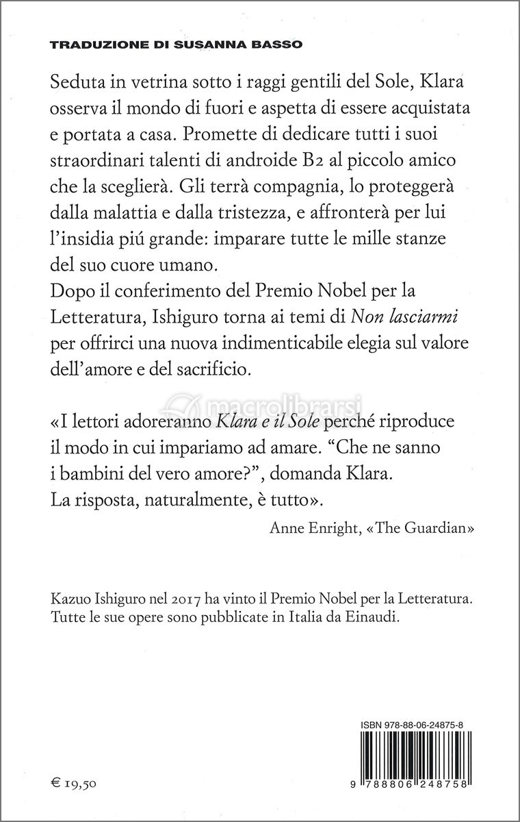 Nel primo romanzo dopo il conferimento del Premio Nobel per la Letteratura, Ishiguro torna ai temi esplorati in Non lasciarmi per offrirci una nuova meditazione indimenticabile e struggente sul valore dell’amore e del sacrificio e sulla complessità del cuore umano, composito e sfaccettato come i riquadri in cui si fraziona la vista dell’androide Klara.