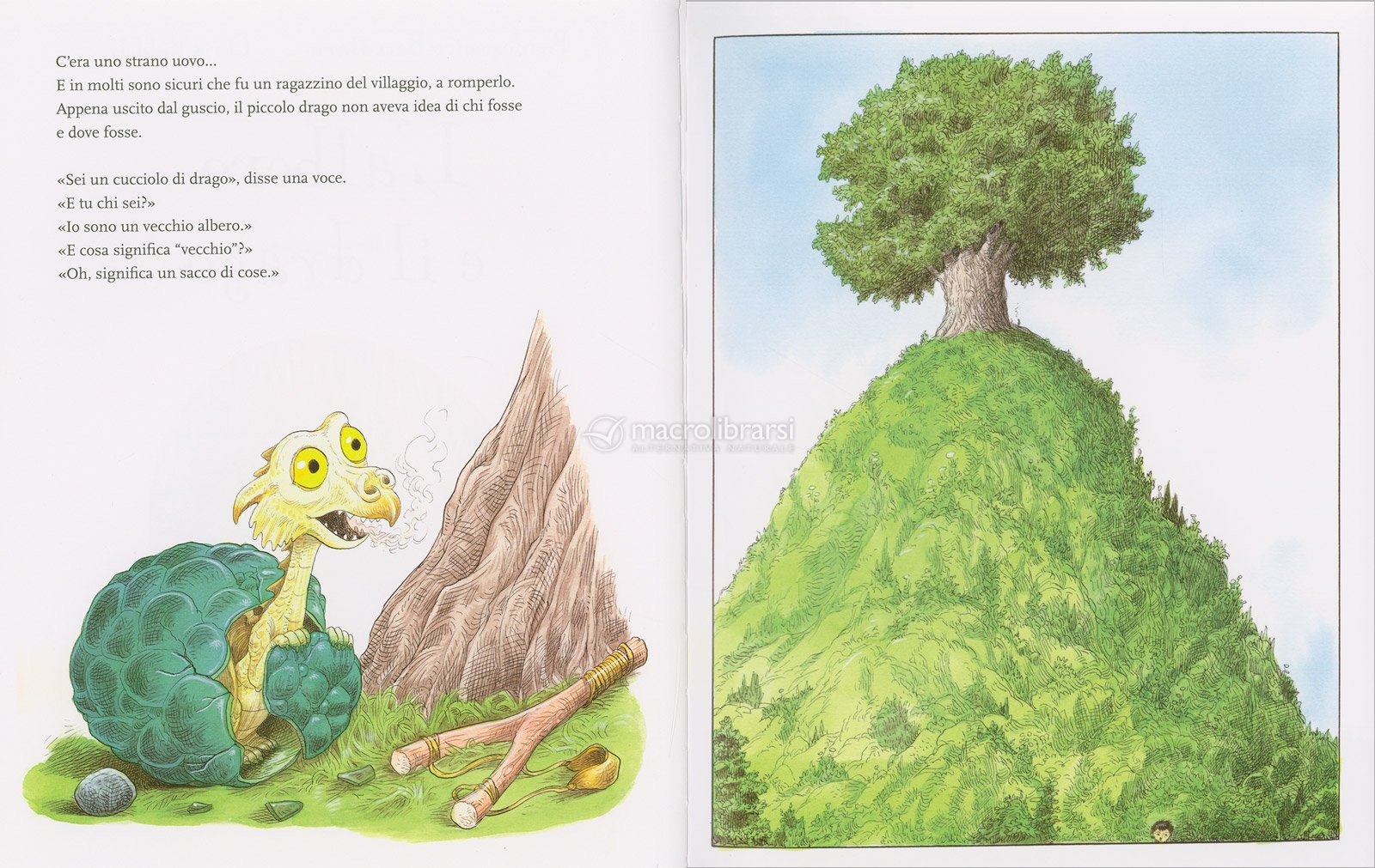 Ai piedi di un grande albero nasce un piccolo drago curioso, pieno di domande e di meraviglia.