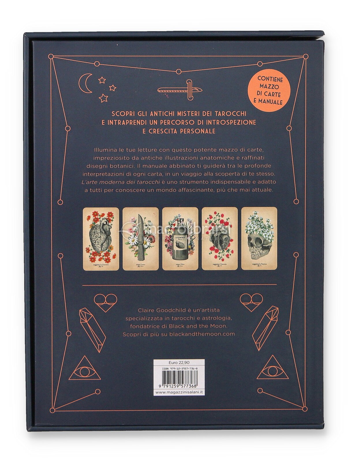 | Confezione | Cofanetto: Libro + Mazzo di carte (arcani maggiori e minori) |