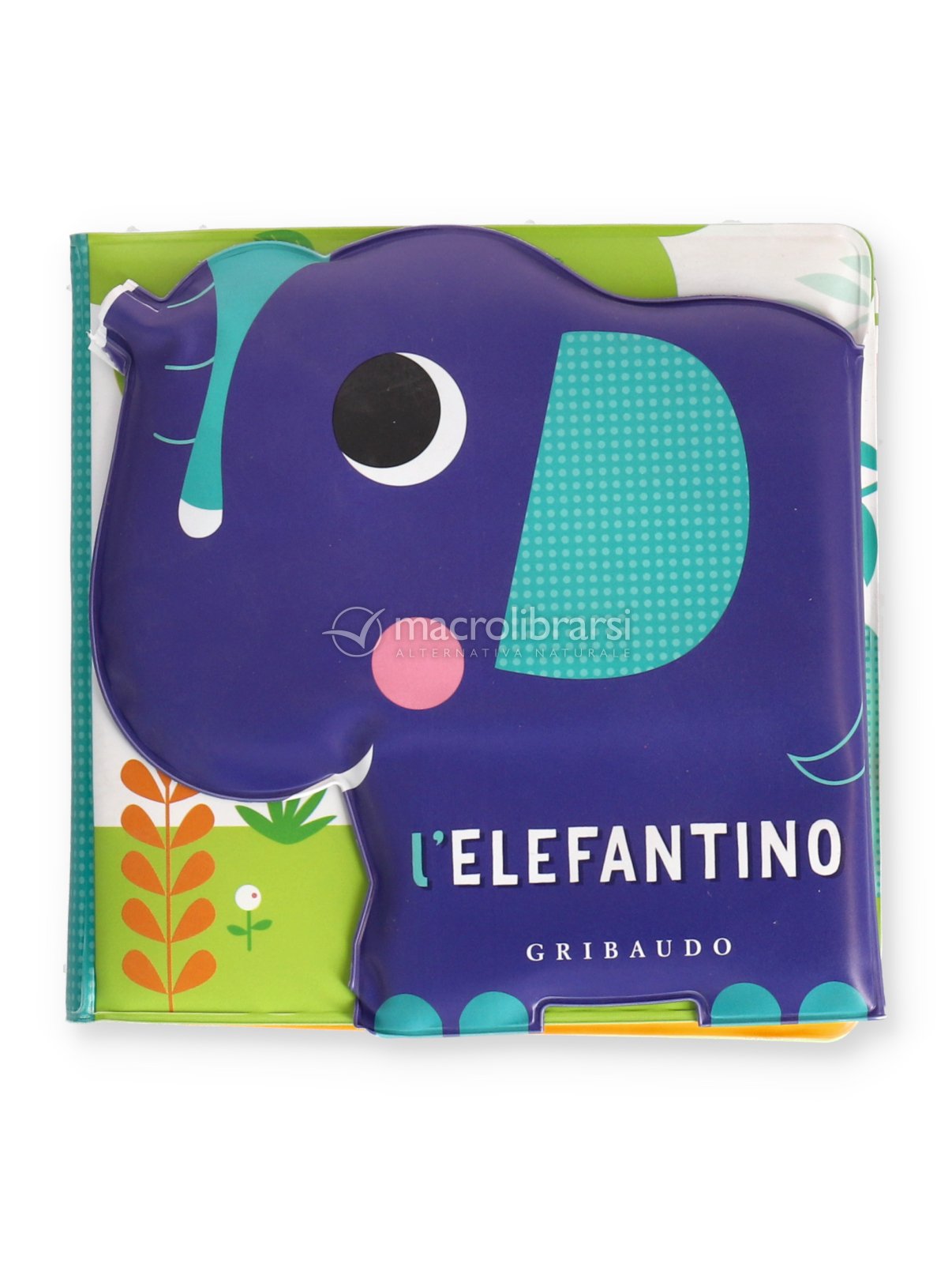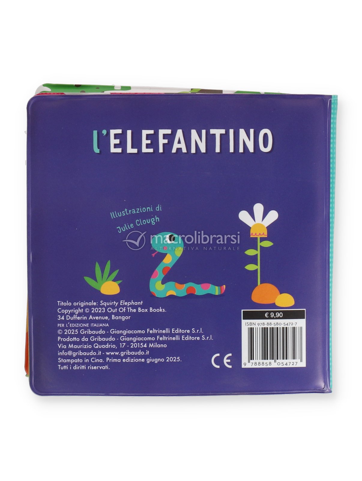 Immergi il libro nell’acqua, riempi la proboscide dell’elefantino, poi premilo e spruzza l’acqua!