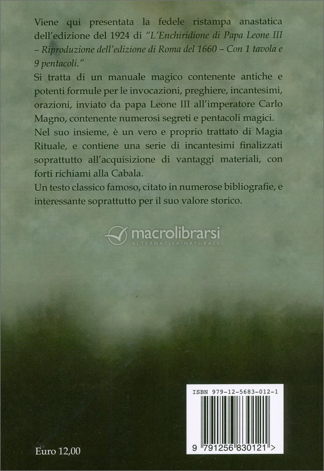 Viene qui presentata la fedele ristampa anastatica dell'edizione del 1924 di "L'Enchiridione di Papa Leone III - Riproduzione dell'edizione di Roma del 1660 - Con 1 tavola e 9 pentacoli."