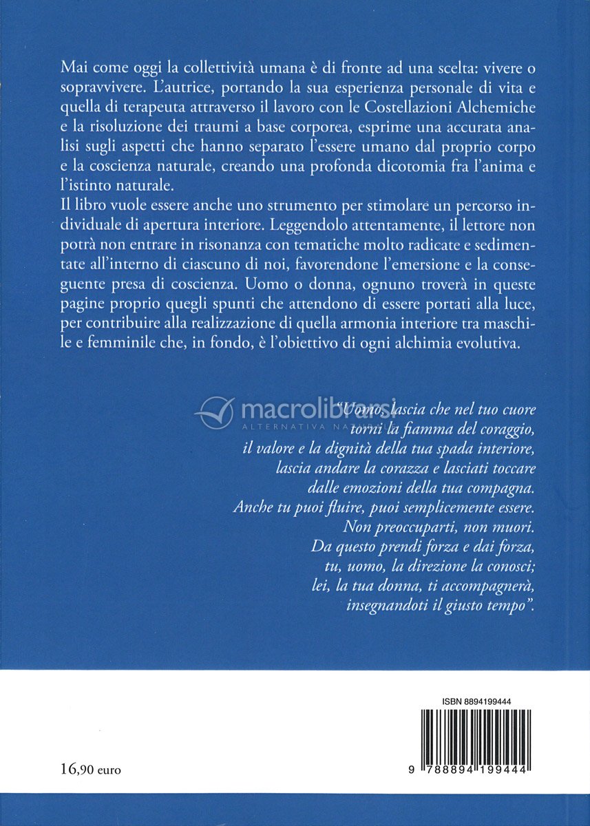 L’autrice, portando la sua esperienza personale di vita e quella di terapeuta attraverso il lavoro con le Costellazioni Alchemiche e la risoluzione dei traumi a base corporea, esprime una accurata analisi sugli aspetti che hanno separato l’essere umano dal proprio corpo e la coscienza naturale, creando una profonda dicotomia fra l’anima e l’istinto naturale.