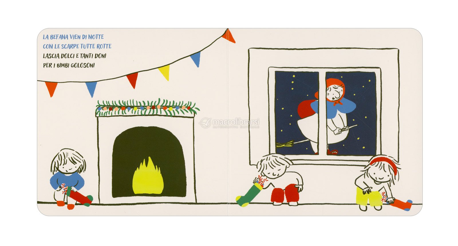 Ispirandosi ai versi popolari più amati, l’autrice segue una scopa volante attraverso scene piene di colore e tenerezza, rendendo questa figura un po’ in ombra rispetto a Babbo Natale finalmente luminosa e vicina ai bambini.