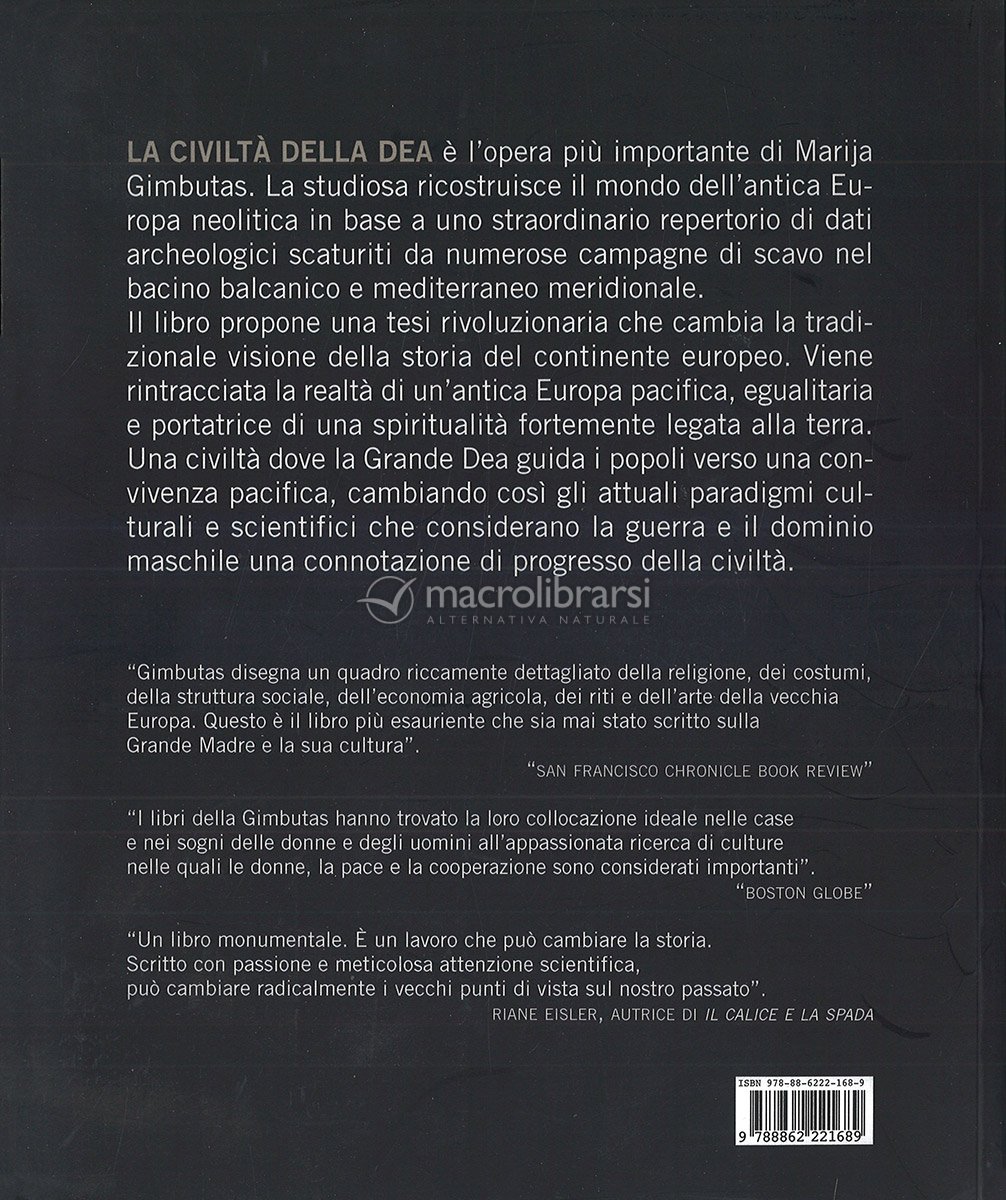 "La civiltà della dea" è l'opera più importante di Marija Gimbutas e rappresenta un caposaldo per chi si vuole avvicinare agli studi sulla Dea. In questo primo volume l’autrice ricostruisce l'antica Europa neolitica analizzando numerosissimi reperti archeologici provenienti dai Balcani e dal Mediterraneo meridionale, e facendo riferimento a documenti storici e linguistici. Elabora la mappatura delle popolazioni e delle culture d'età neolitica in Europa, a partire da un primo nucleo sud-orientale che progressivamente si espande verso Nord e Occidente.
