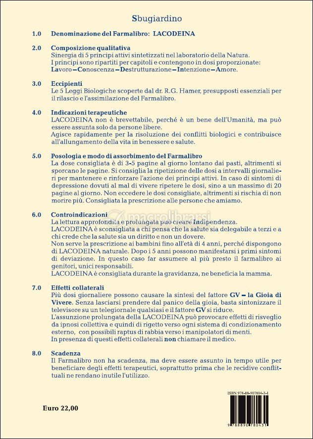 La lettura approfondita e prolungata può creare Indipendenza. LACODEINA non è consigliata a chi pensa che la salute sia delegabile a terzi e a chi crede che la salute sia un diritto e non un dovere. Non serve la prescrizione ai bambini fino all'età di 4 anni, solo perché dispongono di LACODEINA naturale. A partire dai 5 anni possono manifestarsi i primi sintomi di deviazione sociale. In questo caso far assumere al più presto il farmalibro ai genitori, unici responsabili. LACODEINA è consigliata durante la gravidanza, ne beneficia la mamma.