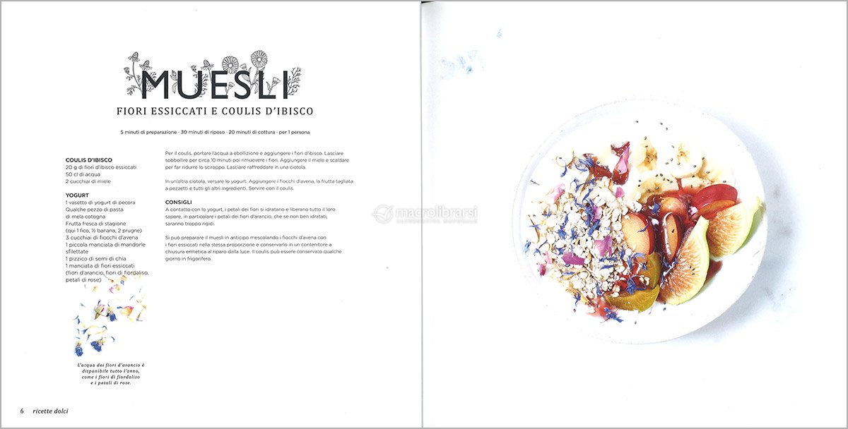 Le quarantacinque ricette dolci e salate coprono tutte le tappe del menu dall’antipasto al dolce, ma non mancano suggerimenti anche per cocktail, smoothie, sorbetti, gelati e ghiaccioli. Dagli Involtini primavera ai fiori di salvia ananas al Crumble di ciliegie ai fiori di sambuco c’è il modo di assicurare una tavola fiorita tutto l’anno.