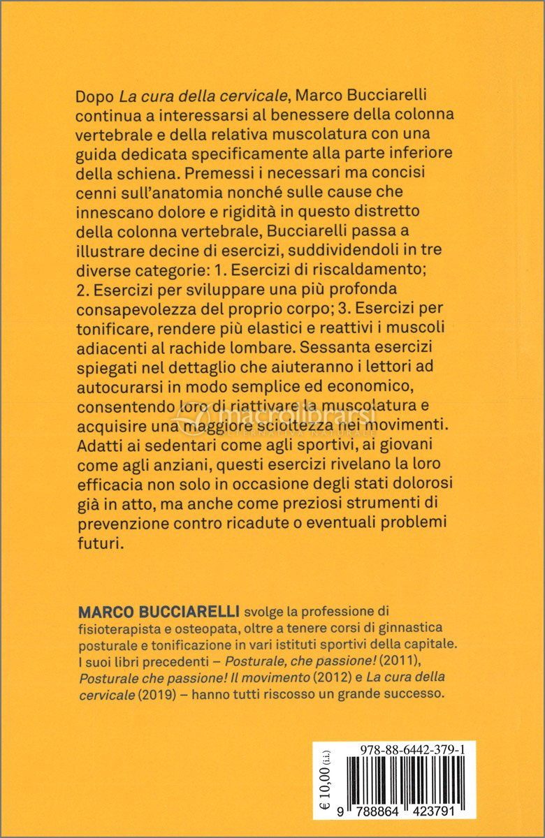 Dopo La cura della cervicale, Marco Bucciarelli continua a interessarsi al benessere della colonna vertebrale e della relativa muscolatura con una guida dedicata specificamente alla parte inferiore della schiena.