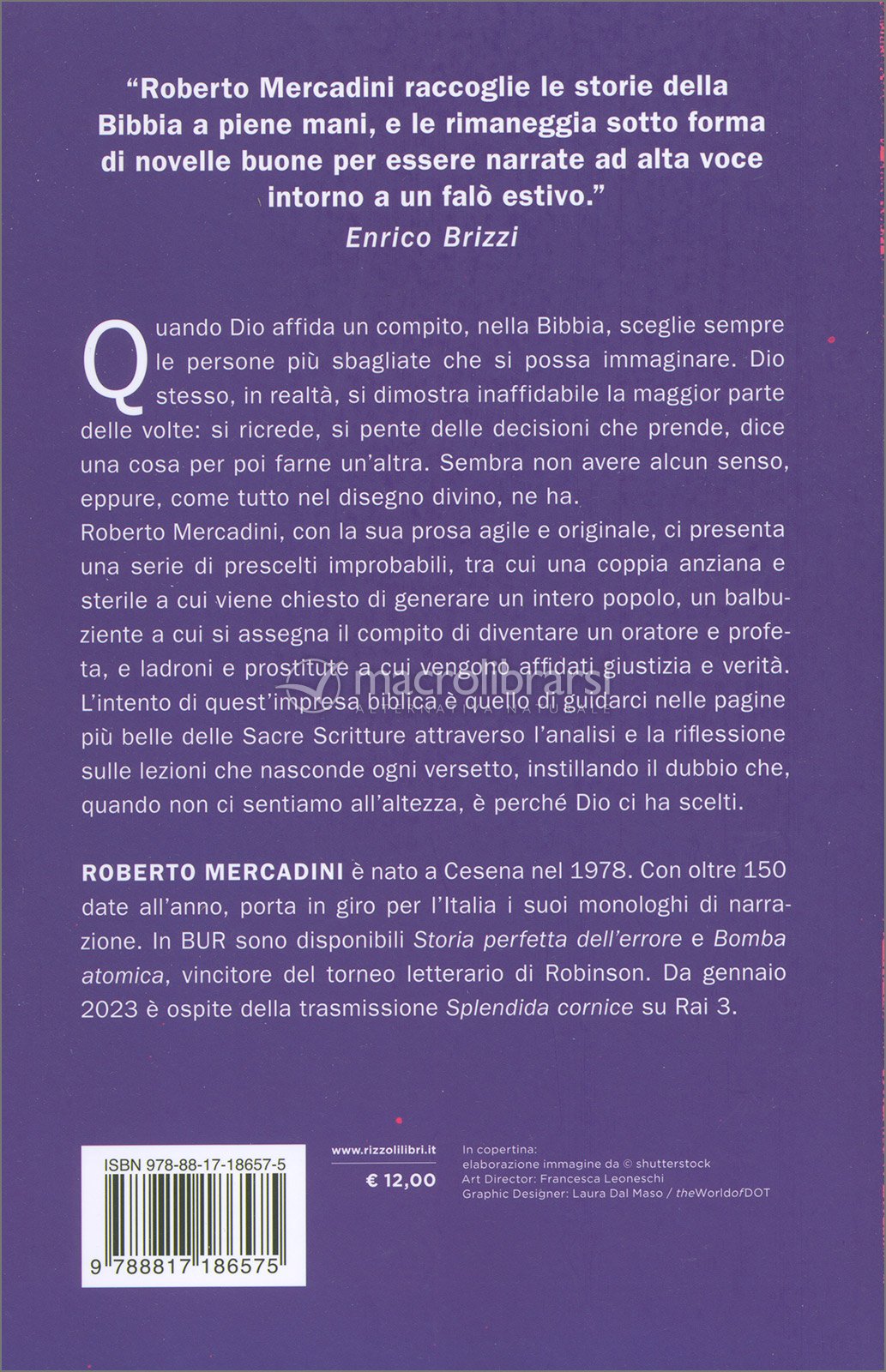 Roberto Mercadini, con la sua prosa agile e originale, ci presenta una serie di prescelti improbabili, tra cui una coppia anziana e sterile a cui viene chiesto di generare un intero popolo, un balbuziente a cui si assegna il compito di diventare un oratore e profeta, e ladroni e prostitute a cui vengono affidati giustizia e verità.