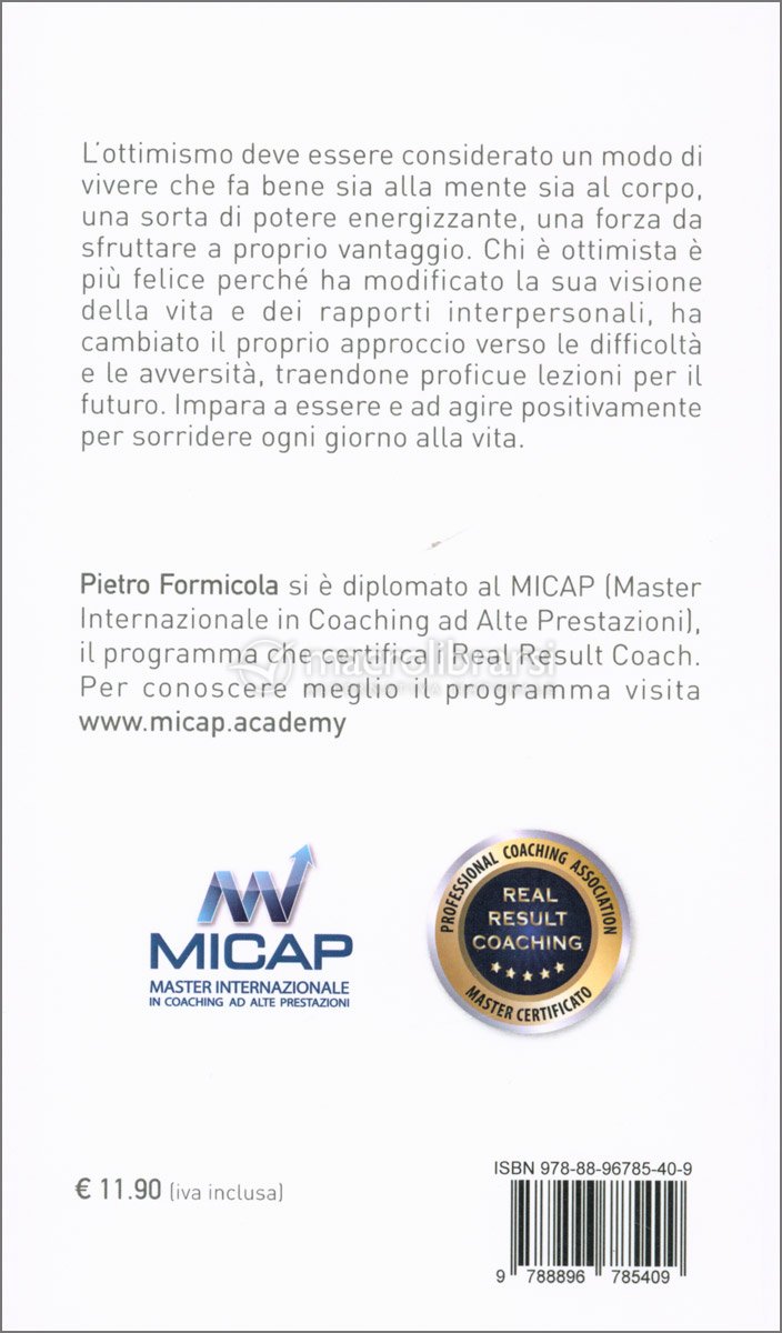 Questo libro ti insegnerà cosa fare di concreto per essere ottimista e per sfruttare la forza che ne deriva: attraverso una serie di esercizi pratici, suggerimenti, esempi e metodi di apprendimento immediati ed efficaci, imparerai ad affrontare la vita con il sorriso sulle labbra, con più serenità e leggerezza d’animo, e a creare nuove opportunità per te e per il tuo futuro.