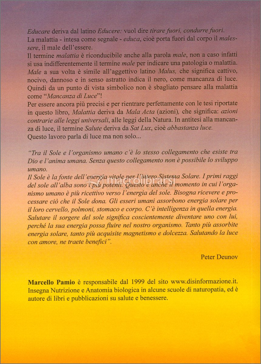Per essere ancora più precisi e per rientrare perfettamente con le tesi riportate in questo libro, Malattia deriva da Mala Acta (azioni), che significa: azioni contrarie alle leggi universali, alle leggi della Natura. In antitesi alla mancanza di luce, il termine Salute deriva da Sat Lux, cioè abbastanza luce. Questo lavoro parla di luce ma non solo...