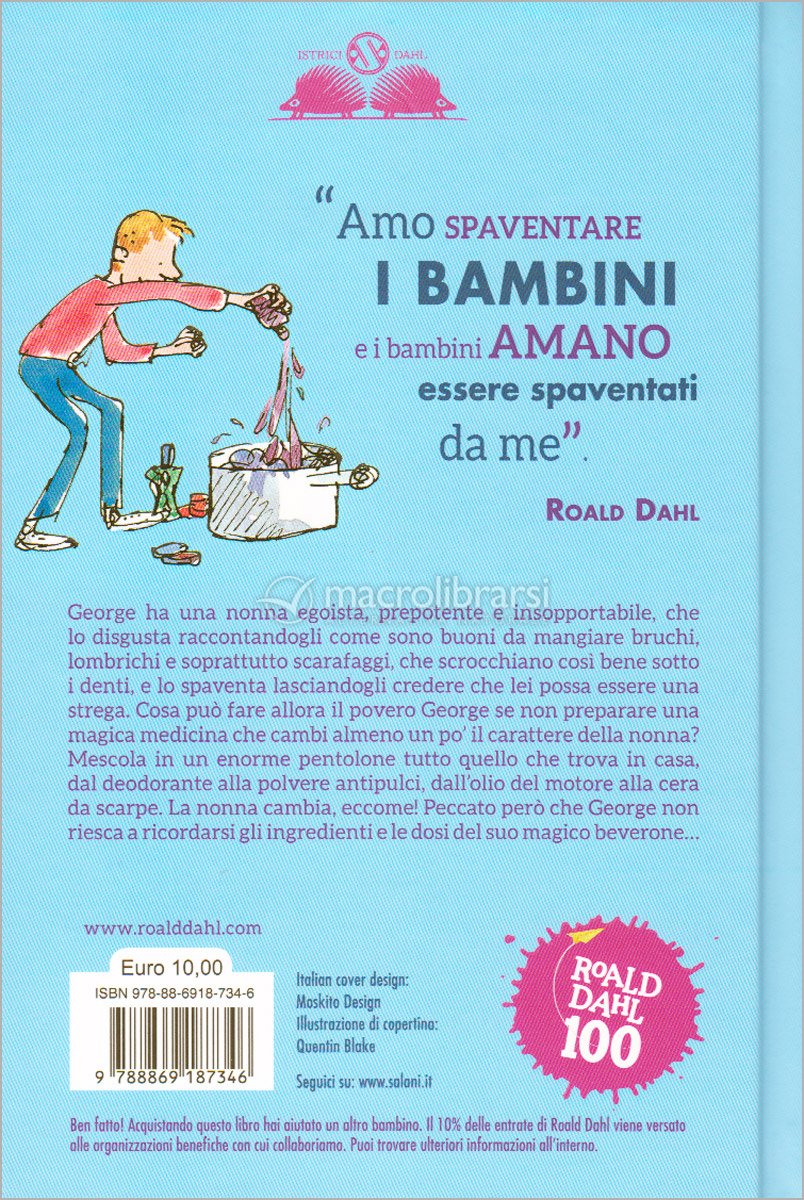 Cosa può fare allora il povero George se non preparare una magica medicina che cambi almeno un po’ il carattere della nonna? Mescola in un enorme pentolone tutto quello che trova in casa, dal deodorante alla polvere antipulci, dall’olio del motore alla cera da scarpe.