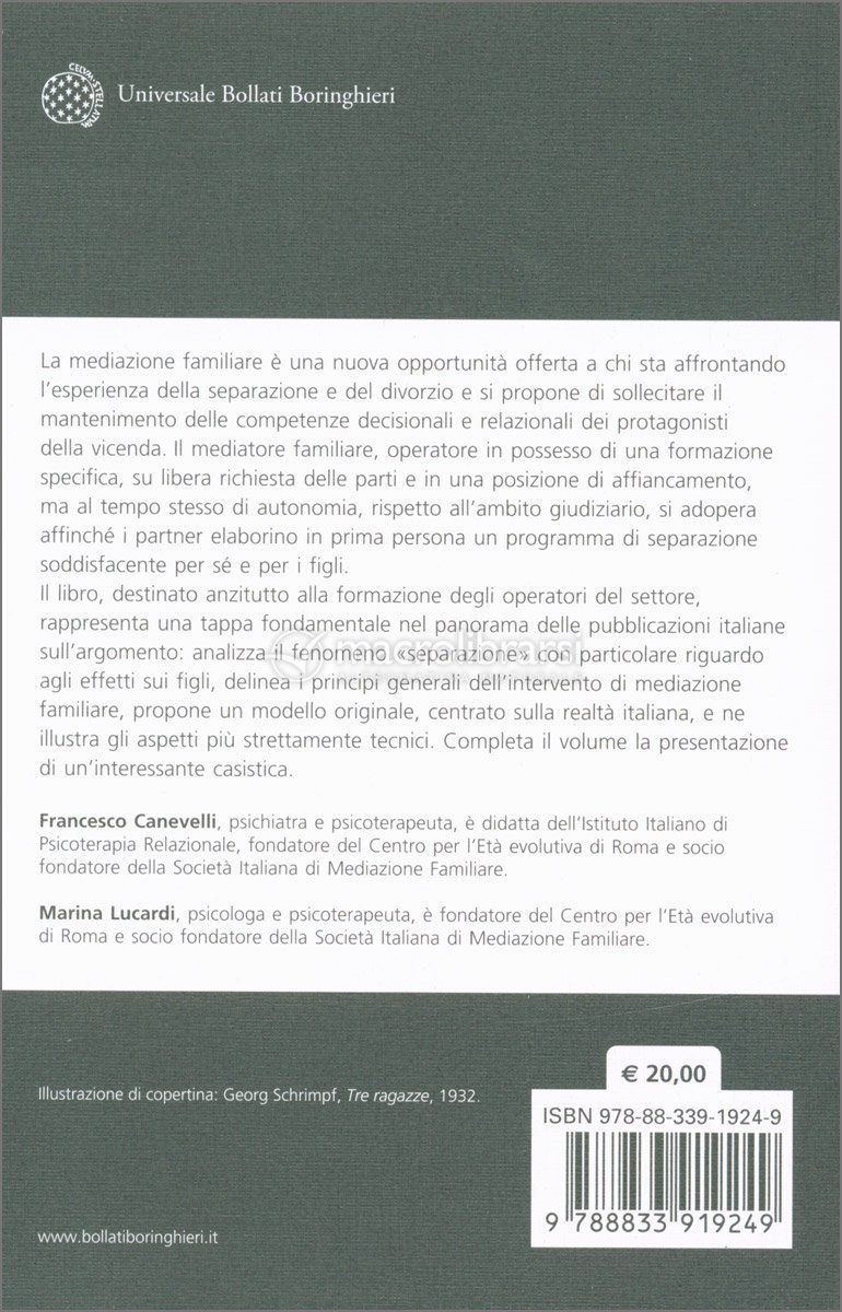 Il libro, destinato anzitutto alla formazione degli operatori del settore, rappresenta una tappa fondamentale nel panorama delle pubblicazioni italiane sull’argomento: analizza il fenomeno «separazione» con particolare riguardo agli effetti sui figli, delinea i principi generali dell’intervento di mediazione familiare, propone un modello originale, centrato sulla realtà italiana, e ne illustra gli aspetti più strettamente tecnici. Completa il volume la presentazione di un’interessante casistica.