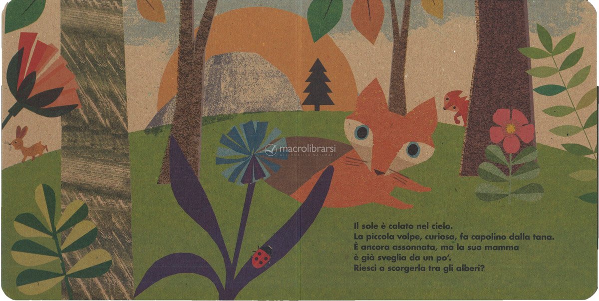 Il sole è calato nel cielo. La piccola volpe, curiosa, fa capolino dalla tana. È ancora assonnata, ma la sua mamma è già sveglia da un po'... riesci a scorgerla tra gli alberi?