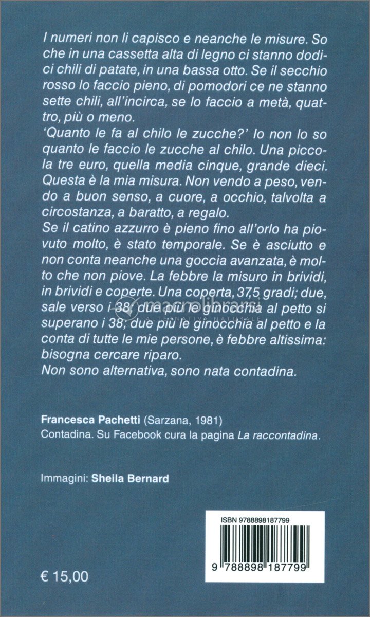 I numeri non li capisco e neanche le misure. So che in una cassetta alta di legno ci stanno dodici chili di patate, in una bassa otto. Se il secchio rosso lo faccio pieno, di pomodori ce ne stanno sette chili, all'incirca, se lo faccio a metà, quattro, più o meno.