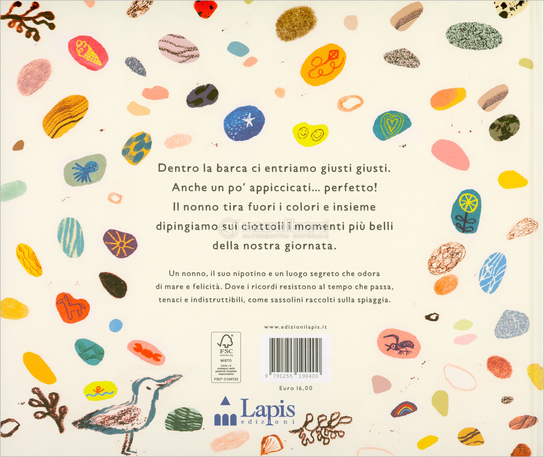 Poi lo lasciano in una vecchia barca sulla riva: ciottoli come fotografie fatte a mano. Ogni pietra racconta un giorno felice, una complicità leggera, fatta di risate, merende rubate dai gabbiani e danze buffe. Poi, un giorno, il nonno cambia casa.