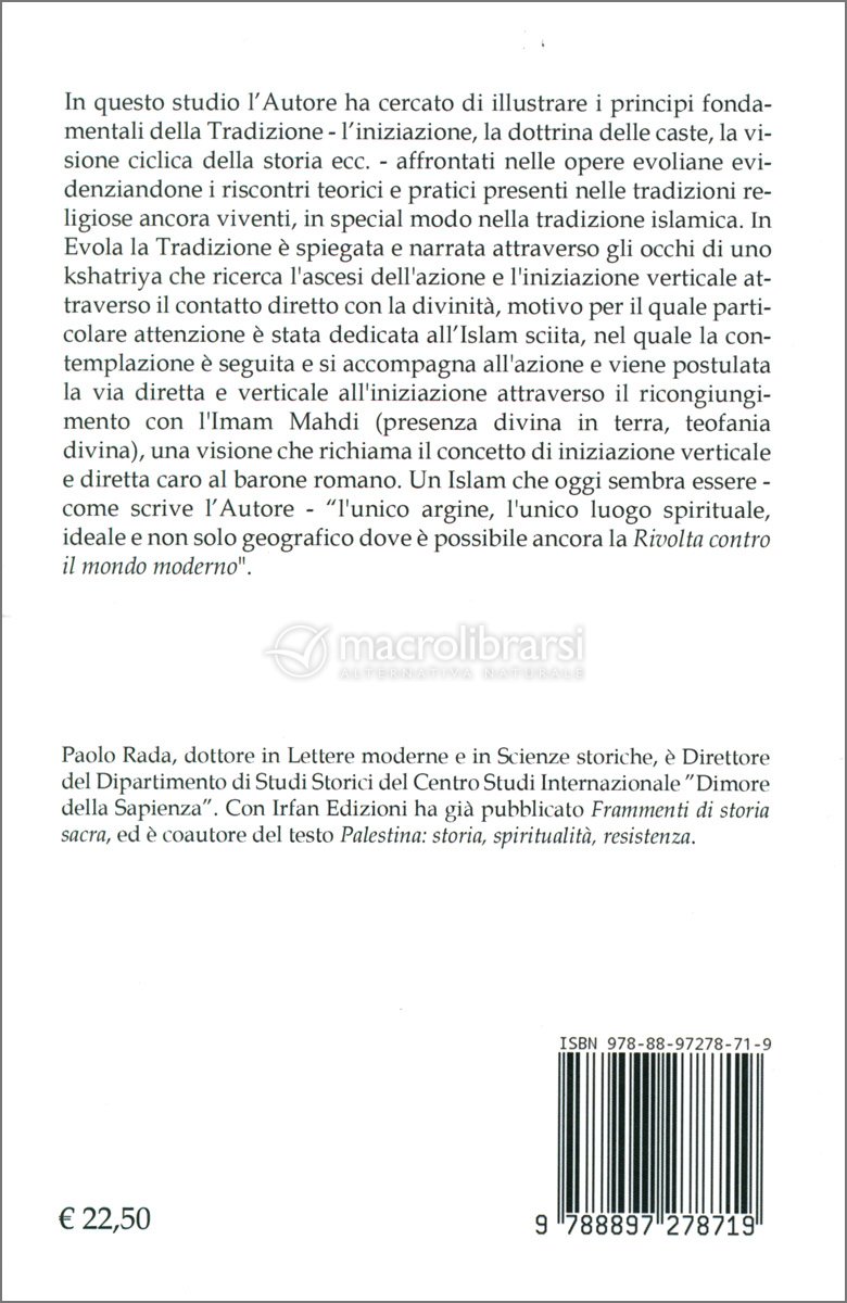 In Evola la Tradizione è spiegata e narrata attraverso gli occhi di uno kshatriya che ricerca l'ascesi dell'azione e l'iniziazione verticale attraverso il contatto diretto con la divinità, motivo per il quale particolare attenzione è stata dedicata all'Islam sciita, nel quale la contemplazione è seguita e si accompagna all'azione e viene postulata la via diretta e verticale all'iniziazione attraverso il ricongiungimento con l'Imam Mahdi (presenza divina in terra, teofania divina), una visione che richiama il concetto di iniziazione verticale e diretta caro al barone romano. Un Islam che oggi sembra essere -come scrive l'Autore - "l'unico argine, l'unico luogo spirituale, ideale e non solo geografico dove è possibile ancora la Rivolta contro il mondo moderno".