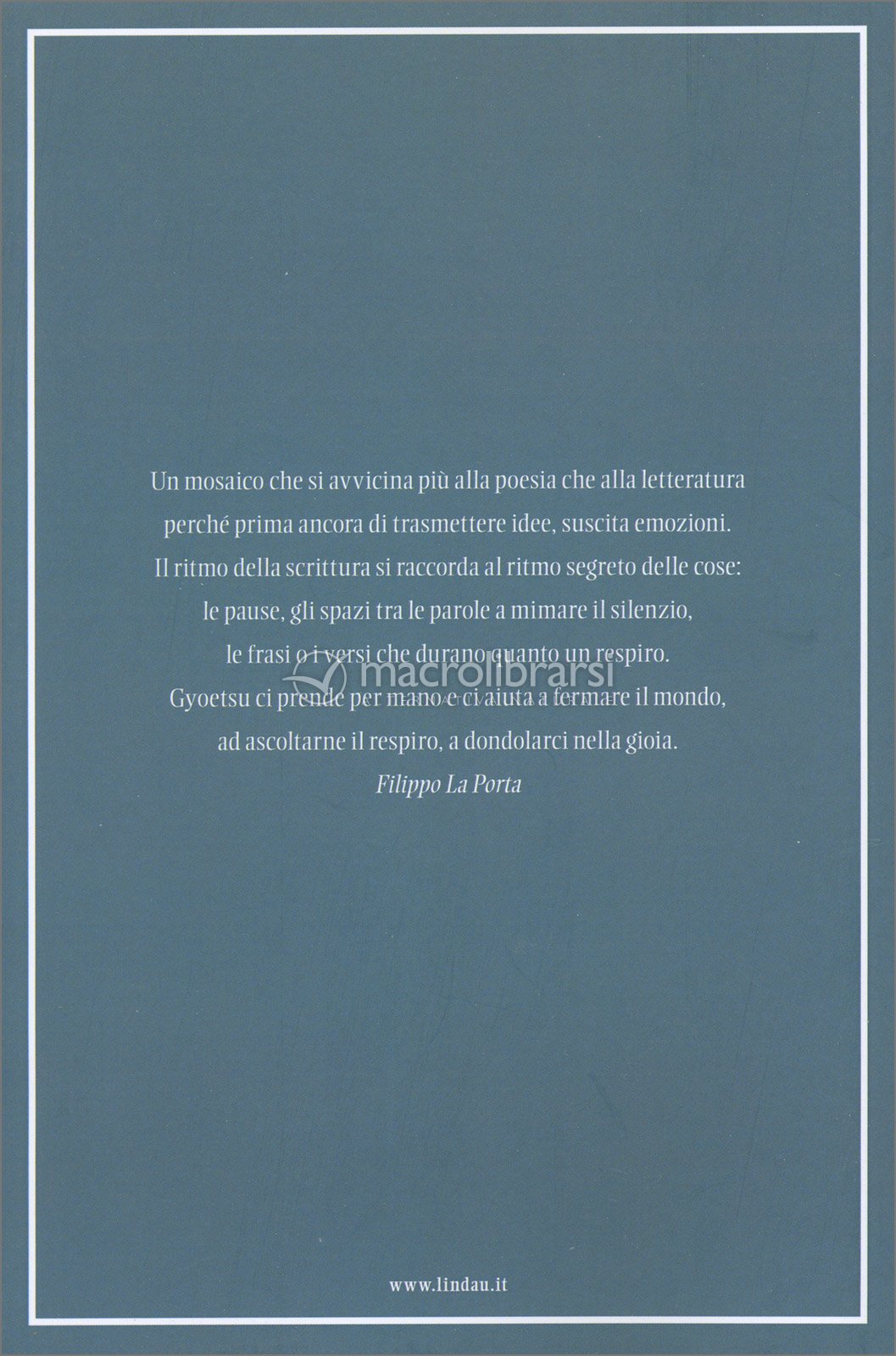 Un libro che si legge come un respiro, tutto scritto con musicalità dall’inizio all’ultima riga. Scorrevole e morbido come una poesia, di quelle che imparavamo a scuola da bambini. Perché ci lascia con la nostalgia anche mentre lo leggiamo. Le parole e i racconti di vita vissuta di Gyoetsu sono un nutrimento per l’anima e balsamo per tutte quelle persone che si sono sentite perse ogni tanto nella vita per l’avere troppa sensibilità. Questo libro mi ha curata, l’ho letto dosandone le pagine, per fruirlo fino in fondo. Da tenere sul comodino e rileggere per trovare ristoro nei momenti difficili, quando ci serve un po’ di leggerezza.