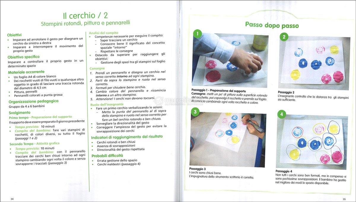 Grazie ad un esercizio sistematico e regolare, il bambino viene guidato passo dopo passo per prepararsi ad affrontare la scrittura corsiva quando giungerà il momento di fare il suo ingresso nella scuola elementare. Le attività proposte sono presentate sempre su una doppia pagina: a sinistra, si trova tutto ciò che riguarda lo svolgimento dell’attività: obiettivi, compiti del bambino, ruolo dell’insegnante, indicatori di raggiungimento del risultato, materiale occorrente, tempo previsto… A destra, una serie di fotografie illustrano i vari passaggi, dalla preparazione del supporto alla fine del compito.