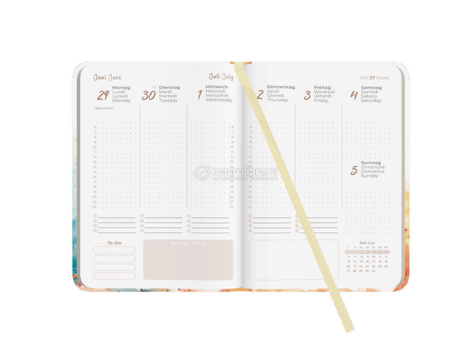 - Visione settimanale chiara: 1 settimana per doppia pagina con divisione oraria dalle 06:00 alle 22:00 – ideale per una pianificazione dettagliata degli appuntamenti