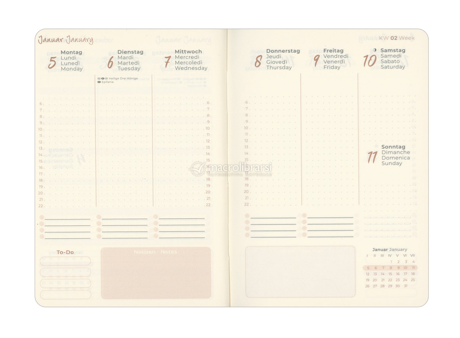 - Planner settimanale: 1 settimana per due pagine con suddivisione oraria dalle 06:00 alle 22:00 – ideale per una pianificazione giornaliera strutturata