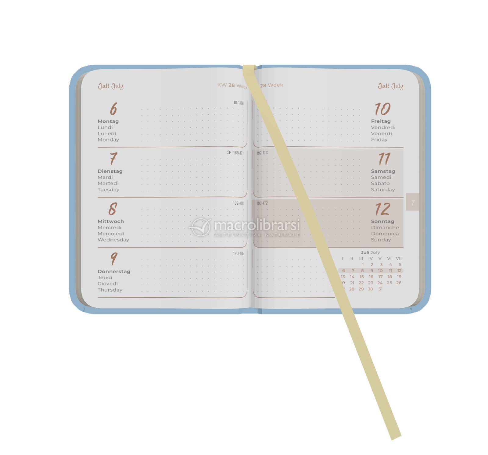 - Dettagli pratici: segnalibro a nastro, angoli delicatamente arrotondati, ampio spazio per appunti e indirizzi