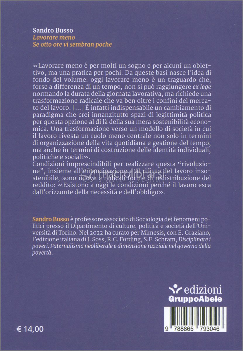 Lavorare meno è per molti un sogno e per alcuni un obiettivo, ma una pratica per pochi. Da queste basi nasce l’idea di fondo del volume: oggi lavorare meno è un traguardo che, forse a differenza di un tempo, non si può raggiungere ex lege normando la durata della giornata lavorativa, ma richiede una trasformazione radicale che va ben oltre i confini del mercato del lavoro. [...]
