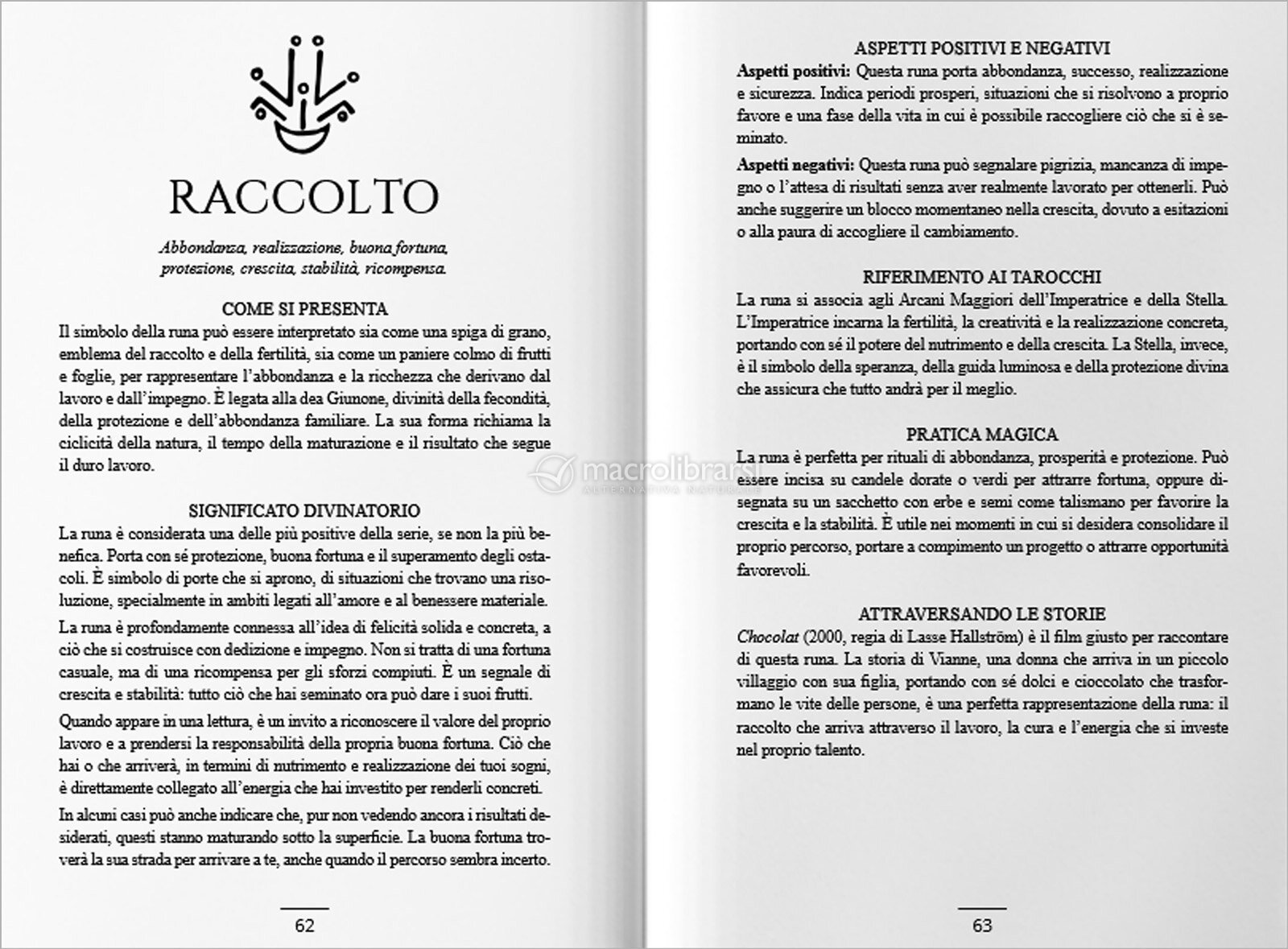 Oltre alla fase creativa, il testo accompagna il lettore nell’uso consapevole di questo strumento. Vengono spiegate in modo chiaro tutte le rune, i loro significati, le possibili combinazioni e le associazioni con i segni zodiacali, offrendo una visione completa e strutturata della pratica divinatoria.