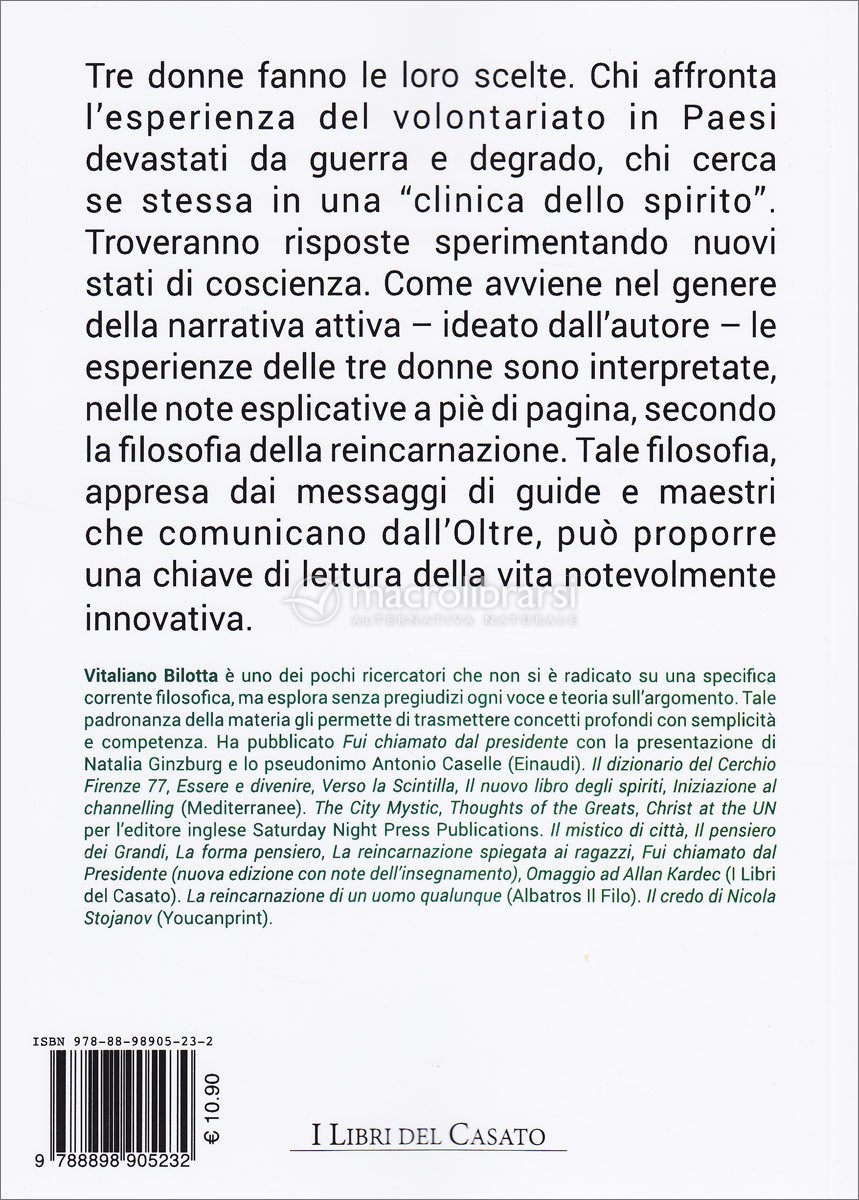 Troveranno risposte sperimentando nuovi stati di coscienza. Come avviene nel genere della narrativa attiva - ideato dall'autore - le esperienze delle tre donne sono interpretate, nelle note esplicative a piè di pagina, secondo la filosofia della reincarnazione.