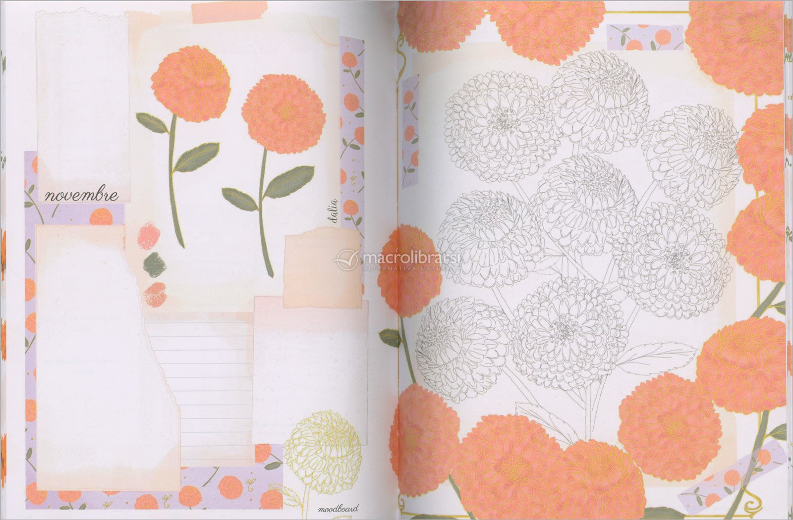 - cornicette, post-it vintage e aree libere dove disegnare, incollare biglietti, raccogliere citazioni e creare ispirazioni visive.