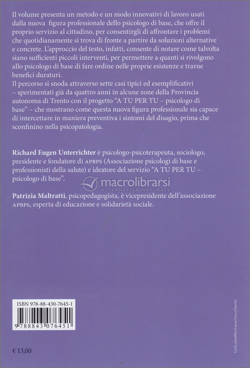 Il percorso si snoda attraverso sette casi tipici ed esemplificativi – sperimentati già da quattro anni in alcune zone della Provincia autonoma di Trento con il progetto “A TU PER TU – psicologo di base” – che mostrano come questa nuova figura professionale sia capace di intercettare in maniera preventiva i sintomi del disagio, prima che sconfinino nella psicopatologia.