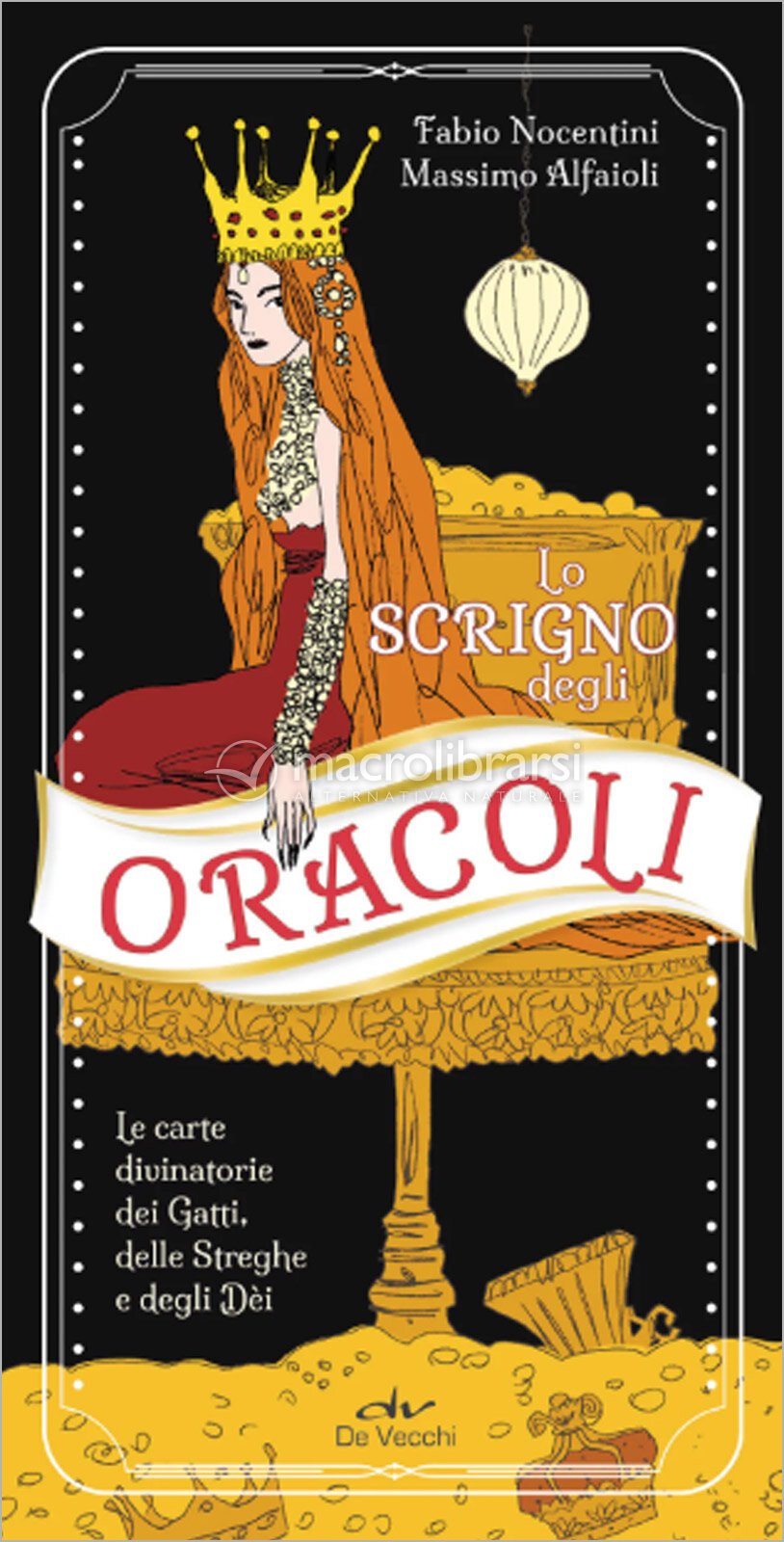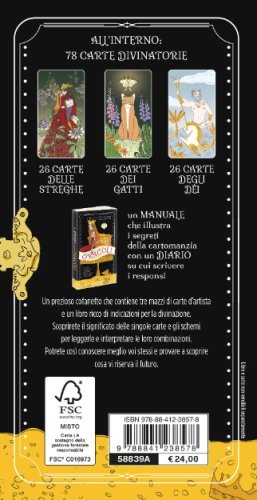 Lo scrigno degli oracoli racchiude tre mazzi di carte d’artista — i Gatti, le Streghe e gli Dèi — insieme a un libro-guida illustrato che ne svela il significato e insegna come leggere e interpretare ogni combinazione.